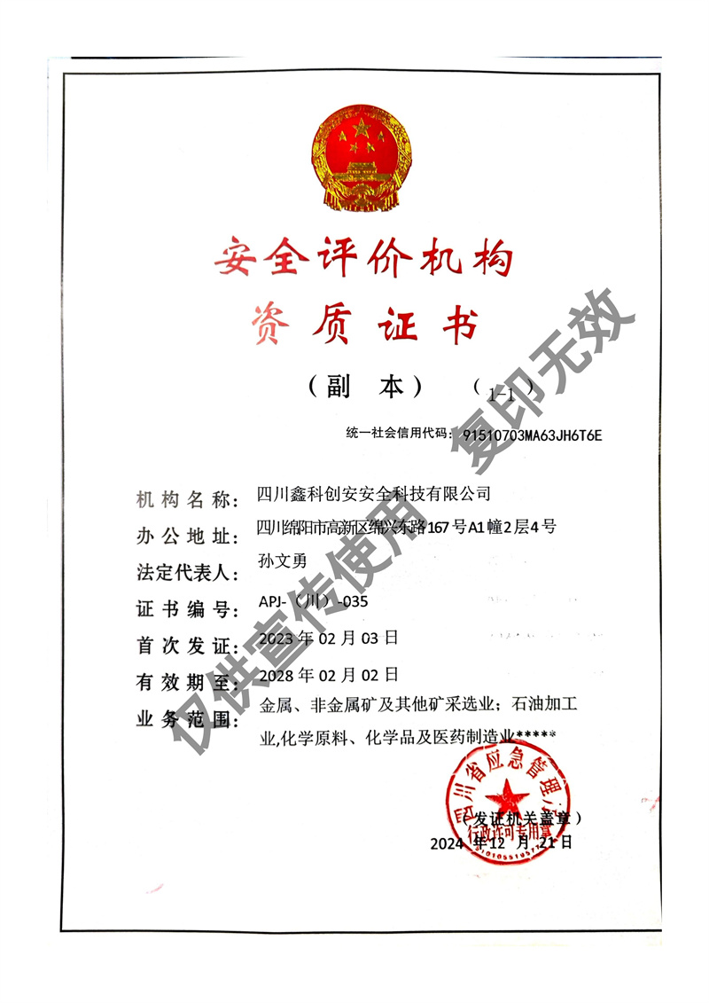 四川鑫科創(chuàng)安安全科技有限公司成立于2020年,是川北地區(qū)取得資質的民營安全評價機構(資質證書編號:APJ-(川)-035)。并于2022年牽頭成立綜合應急救援隊伍 - 綿陽曙光應急救援中心。